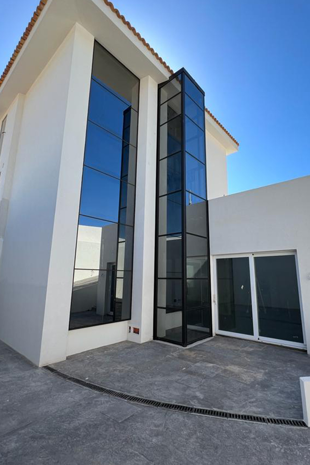 Con i vetri situati fuori dalla proiezione delle traverse, la struttura metallica AF presenta una facciata esterna quasi totalmente vetrata ad effetto full glass.
